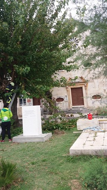 Iako je prvotna ideja bila da se spomenik postavi u klaustru Kuventa, u podnožju masline koja je usađena na 100. godišnjicu Hrvatskog doma, zbog monumentalnosti samog postolja odlučeno je da se on postavi u spomen parku, kojeg su danas uredili članovi DVD-a Viganj.