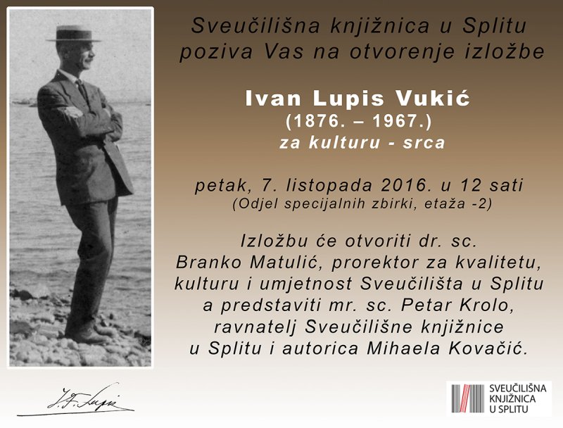 Split, 07.10.2016. – Danas je u 12 sati na Odjelu posebnih zbirki Sveučilišne knjižnice u Splitu otvorena izložba pod nazivom “Ivan Lupis-Vukić (1876 – 1967) – za kulturu srca” u povodu 140 godina rođenja ovog novinara, publiciste i političara. Izložbu je postavila MihaelaKovačić, odabirom stotinjak dokumenata iz bogate zbirke koju su Sveučilišnoj knjižnici u Splitu poklonila njegova djeca Cvitan Lupis i Mara Pilković.