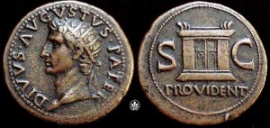 Radi se o bakrenom sesterciju koji je vjerojatno dao iskovati car Tiberije između 31. i 37. god. poslije Krista. Na jednoj strani prikazana je lijevi profil cara Augusta Oktavijana s natpisom DIVVS AVGVSTVS PATER, a s druge je prikazan oltar “providnosti” cara Augusta – Ara Providentiae Augusti, s natpisom PROVIDENT u podnožju i slovima S i C s obje strane. Oznakom SC ( Senatus Consulto) označava se da je novčić kovan uredbom Senata.