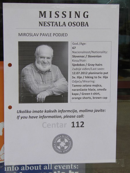 15.07. 2012. (HGSS – Vinko Prizmić) U 09,00 h. Potraga za nestalim slovenskim turistom, jutros se je nastavila još jačim intenzitetom. Noćas su na planini boravile dvije ekipe HGSS-a, a jutros u 05 sati priključilo im se još 6 timova HGSS-a sa potražnim psima. Naime zbog velikih vrućina psi ne mogu biti učinkoviti duže vrijeme pa se potrage u pravilu pojačava u ranim jutarnjim i večernjim satima. Osim vršnog dijela planine, pretražuju se i litice Svietog Ilije koji uz opasnost od pada krije i druge opasnosti koji zahtjevaju tehničke vještine kretanja i pretraživanja. Dvije ekipe HGSS-a iz stanice Ogulin dobile su zadatak da se užetima spuste niz strme stijene te ih pretraže. Potraga se širi i na nove prostore, jer se nezna u kom trenutku i sa kojeg mjesta je nestali turist eventualno skrenuo sa neke od staza i dali se je uopće kretao tim planinarskim prilazima vrhu. Pokušava se naći neki trag, nebi li se smanjilo inače široko područje potrage. Danas su u potragu uz HGSS -ovce iz Orebića, Splita, Ogulina i Dubrovnika, uključeni i pripadnici DVD Orebić, te interventne policije koji zajedno sa GSS-ovcima ponovno pretražuju pristupne putove, te za danas planirane zone potrage