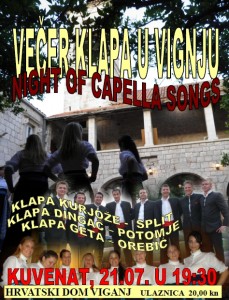 21.07. subota, VEČER KLAPA U VIGNJU (CAPELLA SONG NIGHT)- Kulturna udruga Hrvatski Dom Viganj u suradnji s nekoliko ugostiteljskih objekata i Općinom Orebić u predivnom ambijentu KUVENTA organizira VEČER KLAPA U KUVENTU gdje će s početkom u 19:30 sve zainteresirane zabavljati klape iz bliže i daljnje okolice. Riječ je o ženskoj klapi KURIJOŽE iz Splita, klapi DINGAČ iz Potomja, te klapi GETA iz Orebića. Nakon što otpjevaju svoj repertoar u Kuventu oko 21:00 svaku će klapu ugostiti po jedan viganjski restoran – Konoba MARITIMO, beach bar ČIRINGITO, konoba KARMELA i bistro MONTUN. Tamo će klape nastaviti pjevati gostima navedenih objekata, tako da će se cijeli Viganj oriti klapskim pjesmama.