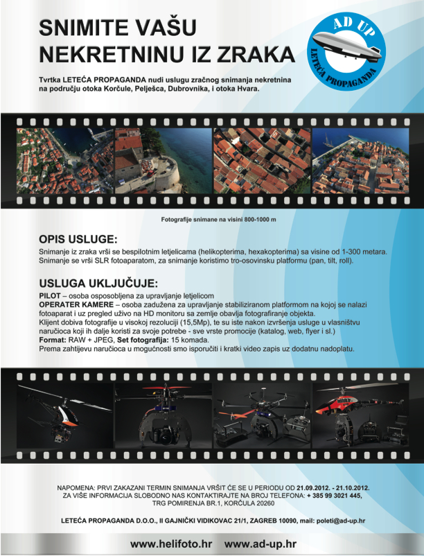 Uslugu zračnog snimanja obavljamo za veča područja cepelinom (više informacija na www.ad-up.hr), a manje objekte helikopterima, hexakopeterima (više informacija na www.helifoto.hr)