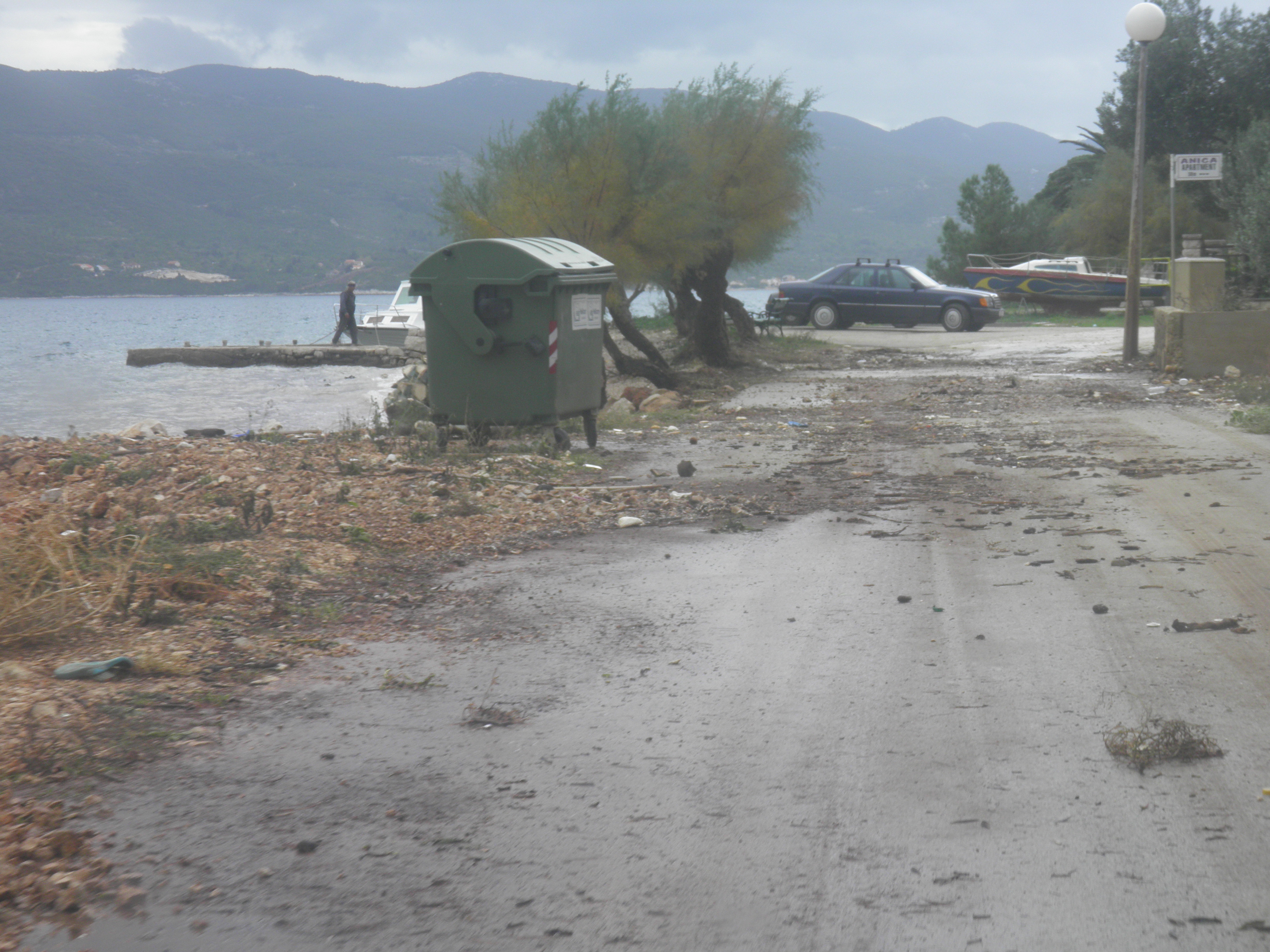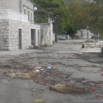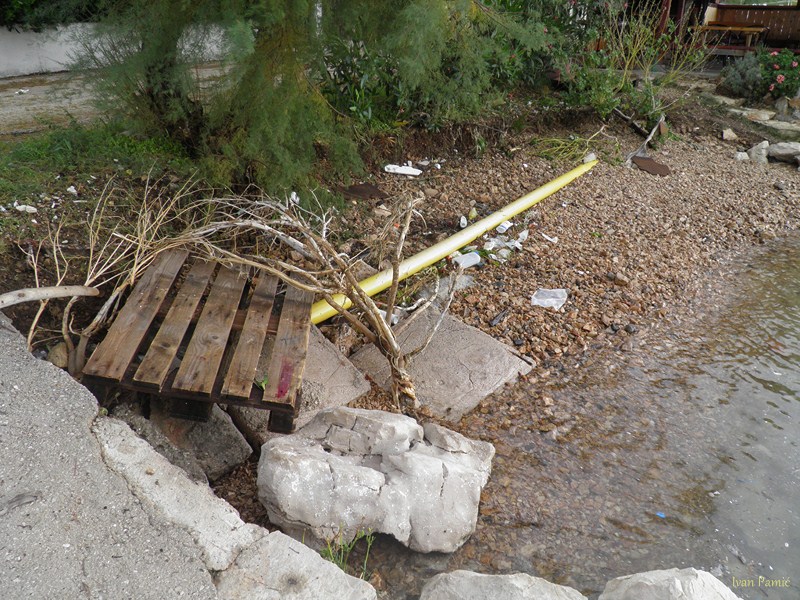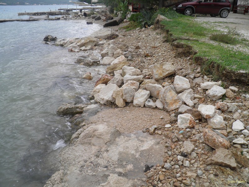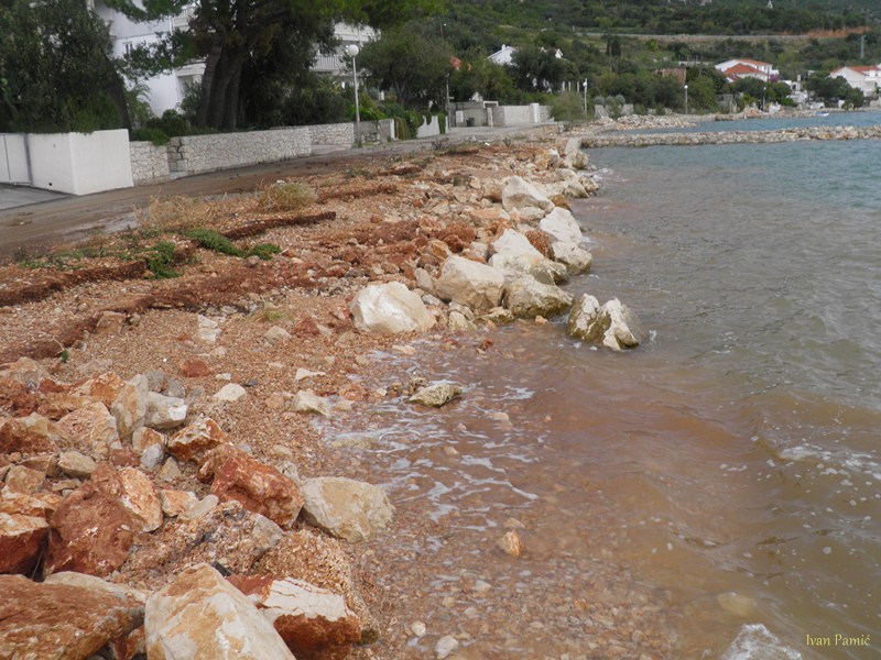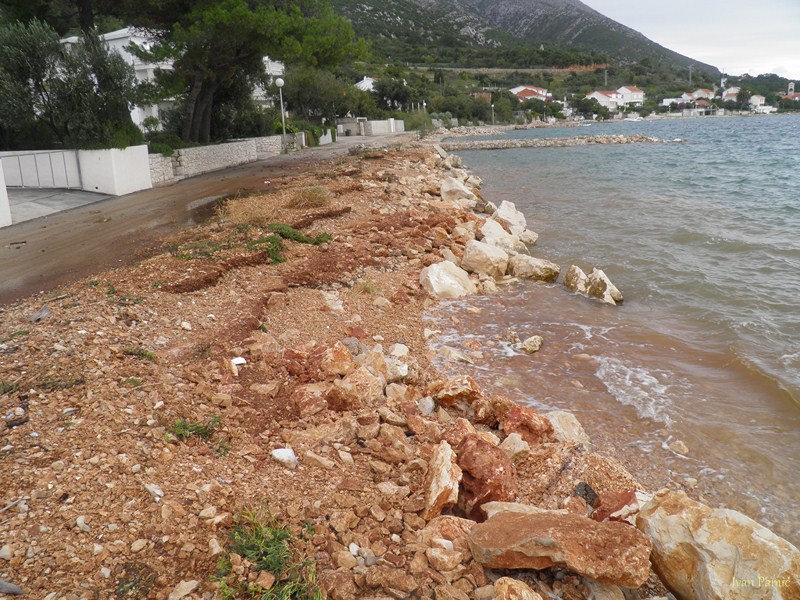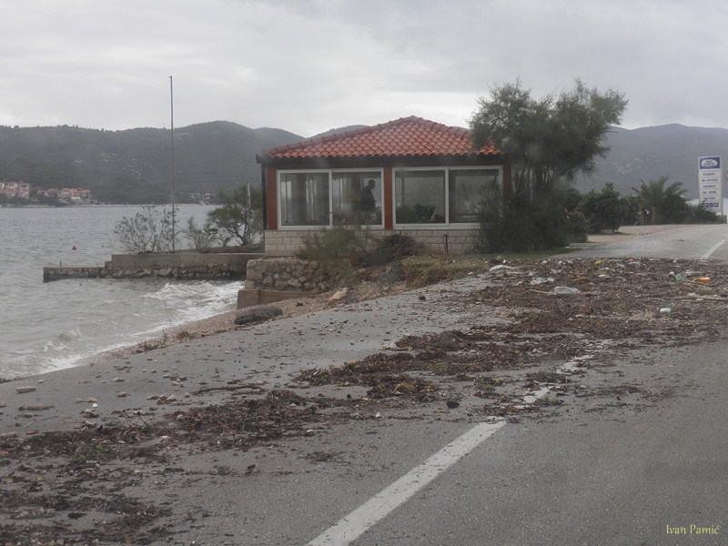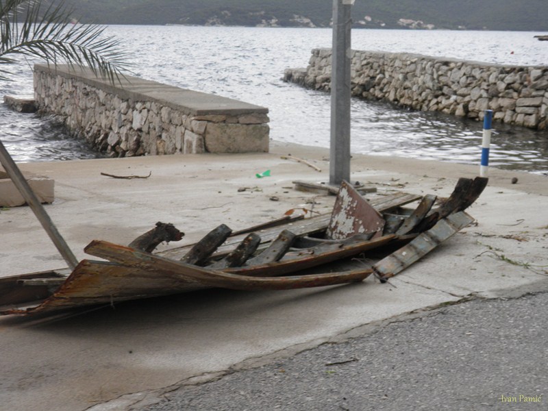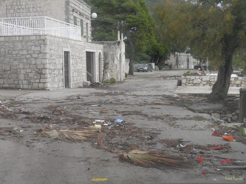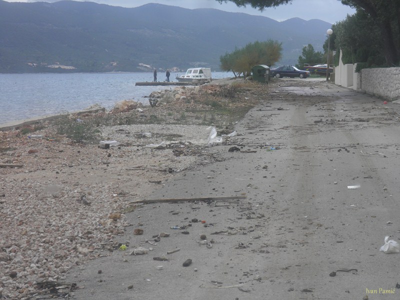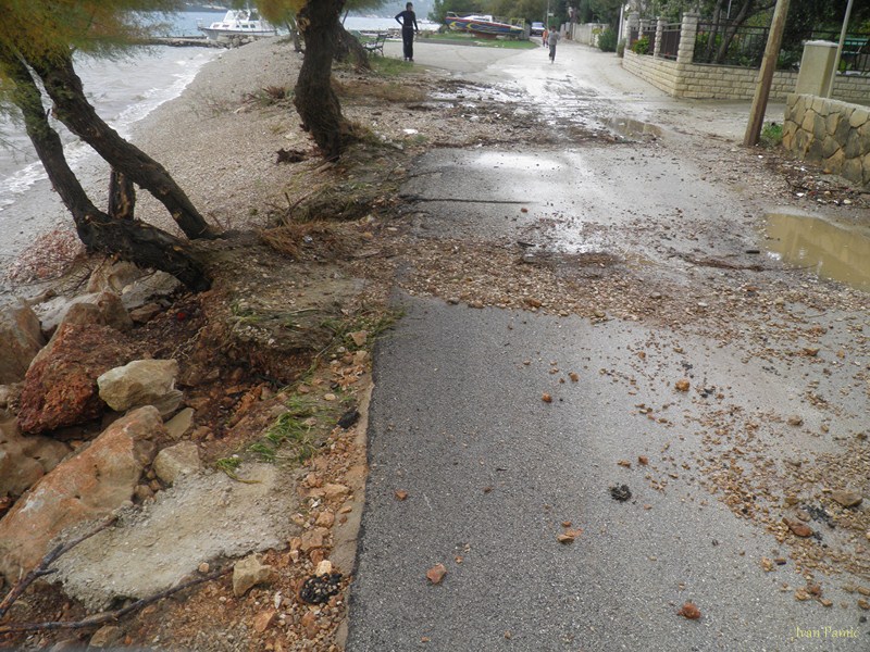 Orebić, Viganj, 01.11.2012. – Ciklona Ladislav praćena jakom južinom u kombinaciji sa visokom oplimom (more se podiglo za više od metra), uzrokovala je tijekom noći veliku štetu na obali od Vignja do Orebića, pri čemu je sjedište Općine najteže stradalo. Na dužini od 1,5 km “Donjeg puta” valovi su na nekoliko mjesta polomili cestu i donijeli velike nasipe žala, kamenja i smeća. Prema riječima načelnika Jurjevića, materijalna šteta mjeri se u stotinama tisuća kuna, a Općina Orebić će tražiti pomoć od Hrvatskih i Županijskih cesta, kako bi se ova prometnica osposobila do turističke sezone.