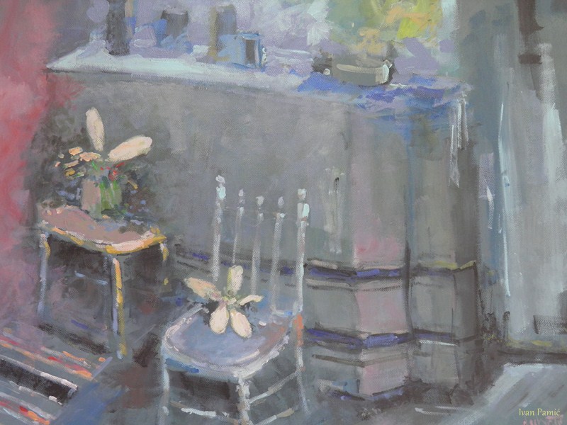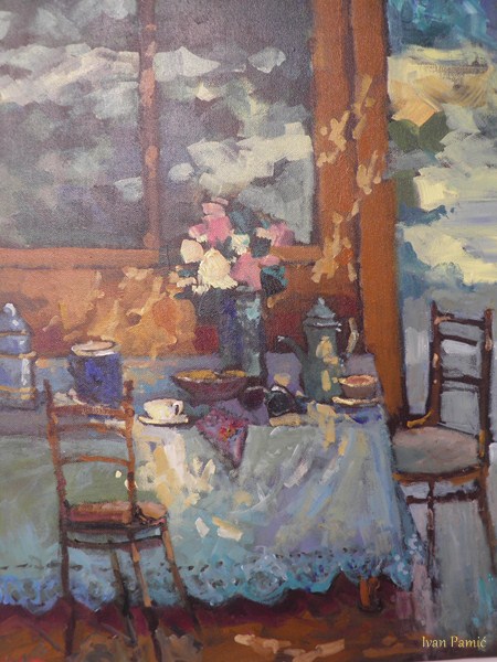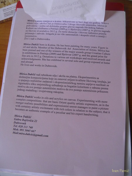 Nino i Mirica Dubčić su evidentno zaljubljenici u klasično slikarstvo i daroviti tvorci svojih djela u koja su svojstvenim senzibilitetom, koloritom, odabirom motiva podastrli svoj likovni kredo – svatko vlastitim i drugačijim djelom. I dok se Nino Dubčić opredijelio za utišani intimistički interijer zagasite palete, melankolične atmosfere gotovo zaborava među dragim stvarima djetinjstva; supruga Mirica bojom i snažnim potezima špahtle slavi eksterijere, raskoš mediteranskog miljea u kojemu živimo i uživamo. Slike dvoje bliskih ljudi čije je slikarsko djelo posve različitog rukopisa, zgodno zamišljeno zajedničkom izložbom ostvarujući kroz različitost specifičnu cjelinu doživljaja, ujedno svjedočanstvo o slikarskoj darovitosti dvoje autora, o velikom radu, emotivnoj predanosti tom stvaralaštvu. Zajednička im je crta ljubav za slikanjem, odabiri motiva i pristupi su individualni ali jednako zreli.
