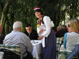 Glad je vrag, kako bi rekli stari, pa smo tako već u Konavlima bili “prisiljeni” potražiti kakav dobar restoran, a jedini pravi izbor u okolici bio je predivan ambijent “Konavoskih dvora”. U sjeni lovorove šume, uz okretanje mlinskih kotača na brzicama rijeke Ljute uživali smo u jelu koje nam je servirala Konavoka u tradicionalnoj nošnji. Kad smo več bili tu odlučili smo posjetiti desetak minuta dalje vožnjom auta nedavno obnovljenu srednjovjekovnu utvrdu Sokol grad.